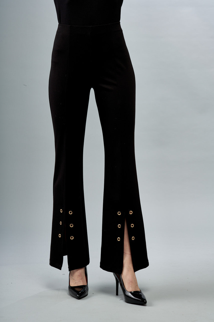 Step out in high fashion in this fabulous Grommet Detail Flared Pant. Made of high quality fabric these pull-on pants with elastic waist feature a flared leg with split hem adorned with golden grommets. Wear with your favorite top or pair with the matching Grommet Sleeve Knit Top for a complete chic ensemble!