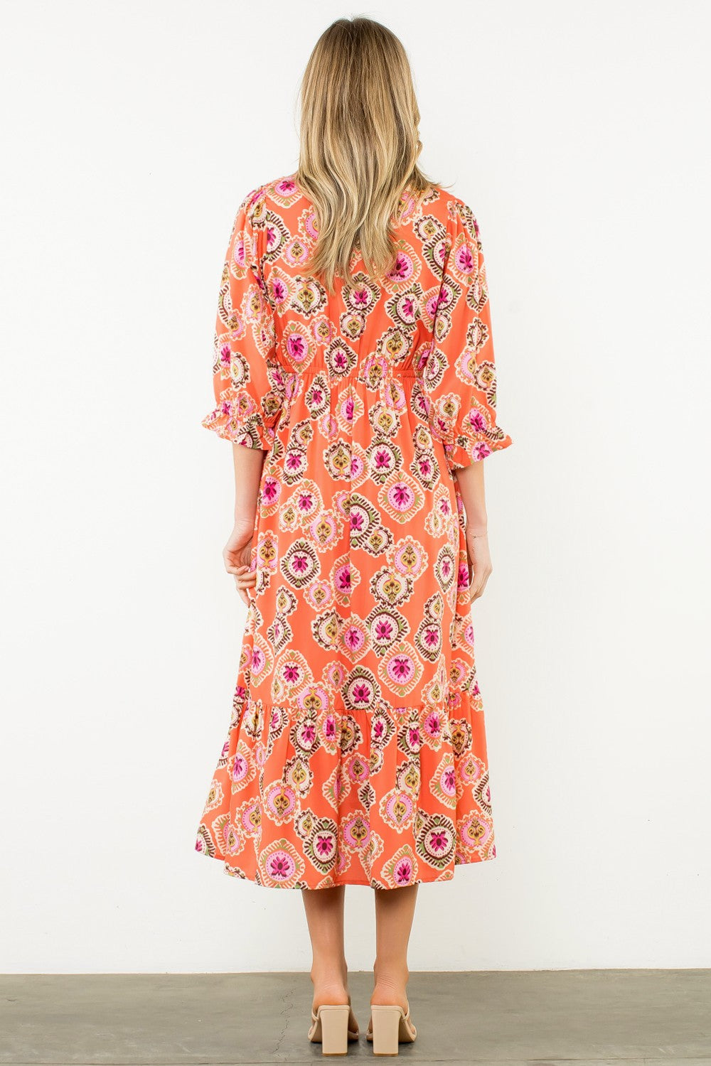 The Accent Trim Maxi Dress in Orange Multi showcases a v-notch neckline enhanced by a contrasting ribbon detail. Its gathered waist provides a perfect fit, while the long sleeves with gathered cuffs create stylish balloon sleeves. The dress is adorned with a vibrant medallion pattern in striking, bold colors and is fully lined for comfort.