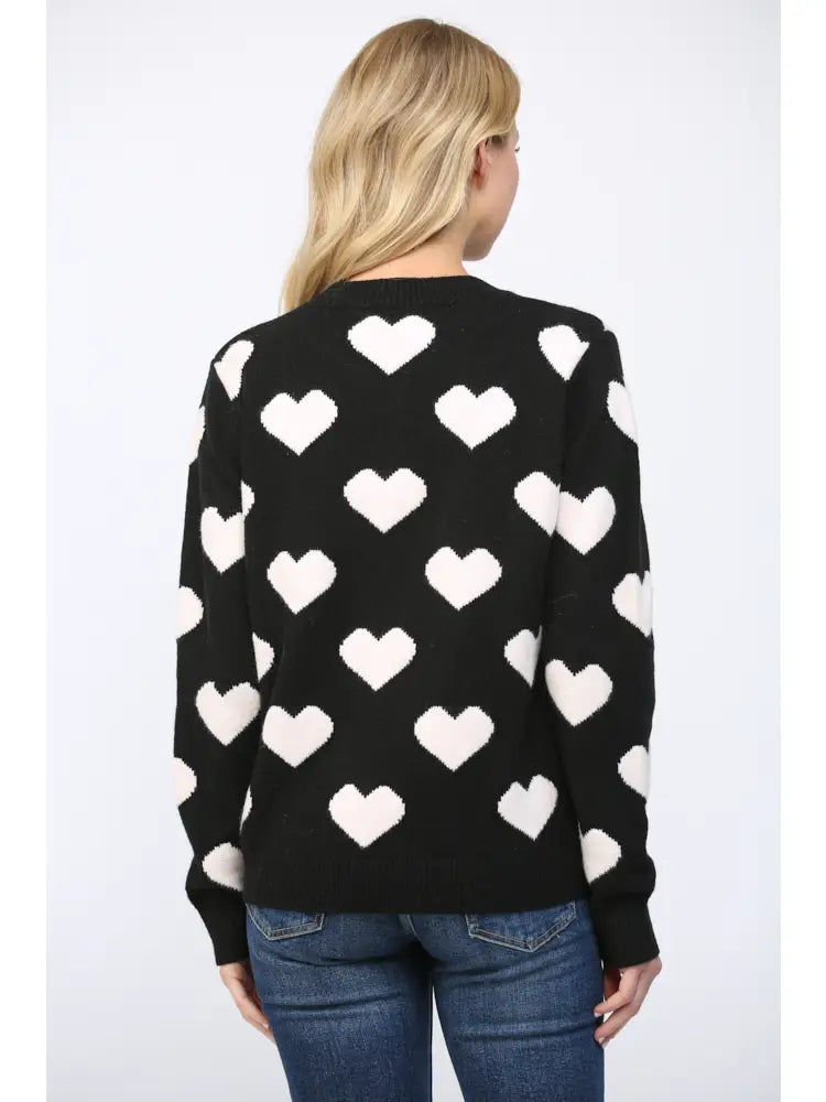 Heart Print Crew Neck Sweater - Black
