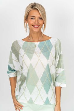 This charming knit top boasts a flattering boatneck and breezy 3/4 dolman sleeves that move effortlessly with you. Made from light, breathable fabric, it offers a relaxed fit that flatters your shape, finished with a softly curved hem. The all-over argyle print adds a touch of playful charm.