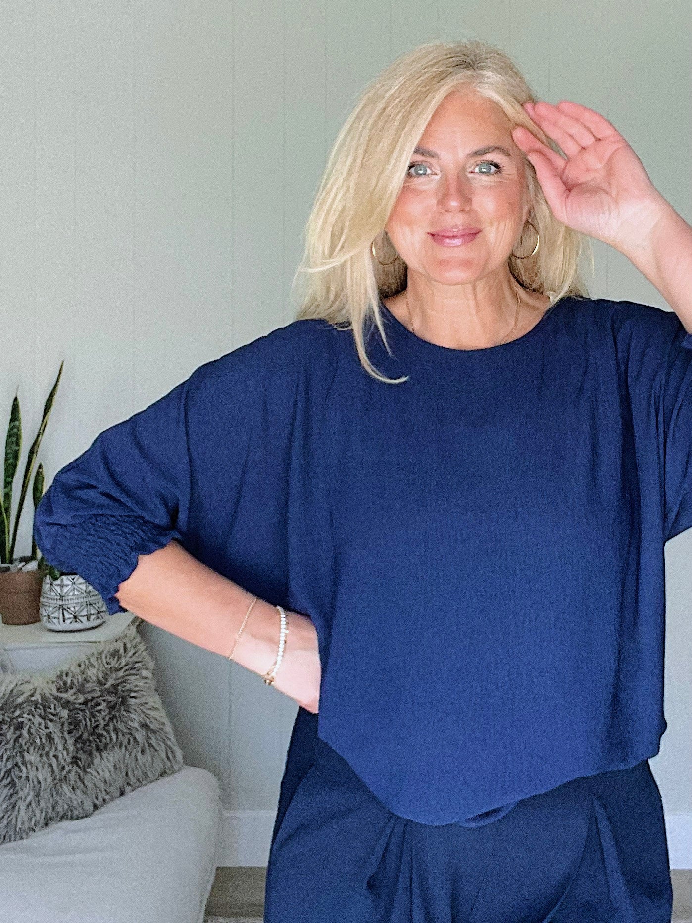 Perfect for the modern traveler, this round neck top combines comfort with understated elegance. The 3/4 sleeves feature gathered cuffs, and the relaxed, flowy fit moves effortlessly with you through airports, offices, and casual outings. Made from slightly textured fabric in a versatile navy, it pairs seamlessly with your favorite pants or the Pleated Wide Leg Pant for a polished finish.