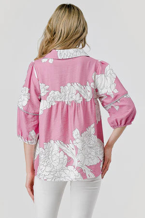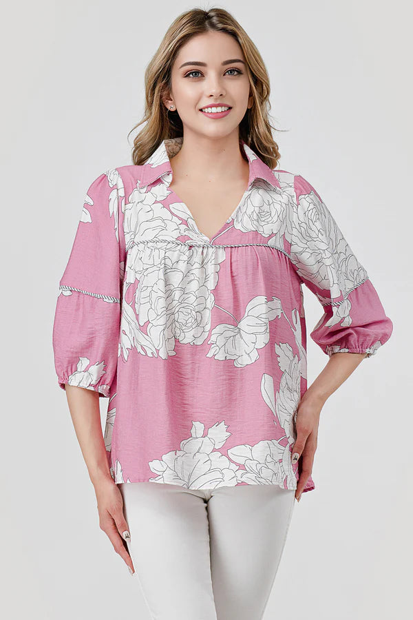 Effortlessly chic and oh-so-comfortable, this floral blouse brings a subtle shade of pink to your wardrobe. The relaxed silhouette and three-quarter sleeves make it perfect for casual days or dressed-up occasions. A charming collar and contrast stripe seam add personality, while the breezy fabric keeps you cool and collected.