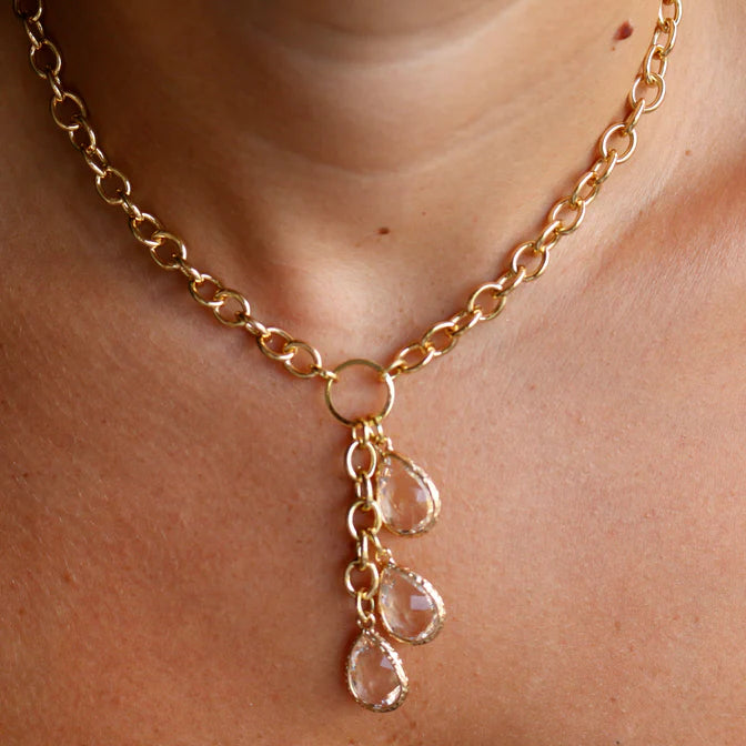This gold plated necklace features a three crystal drop that gives off a party vibe! We will wear this one with our jeans and t-shirt and our best dresses! The teardrop crystals reminded us of "angel rays" coming out of a cloud.