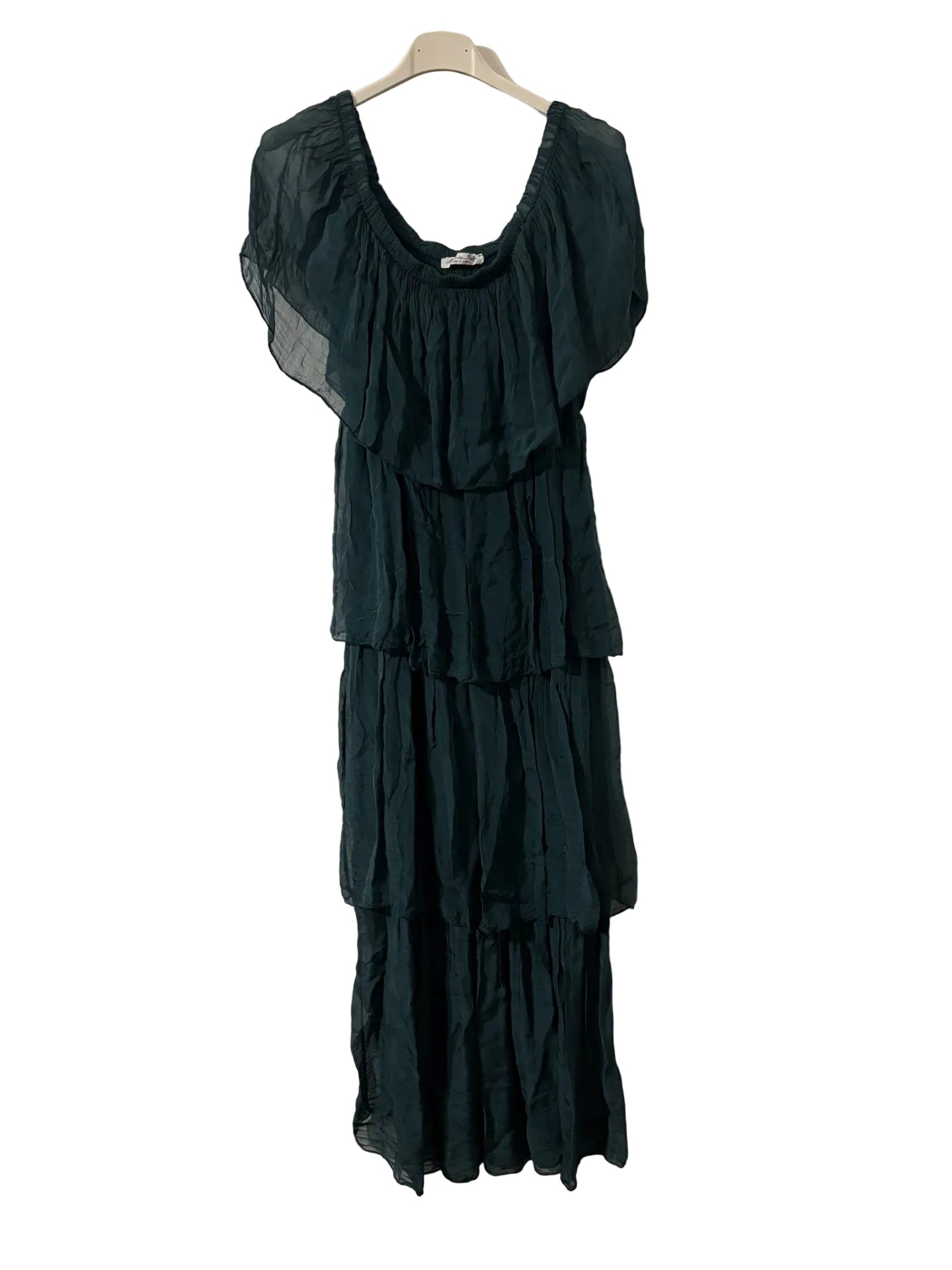 This stunning off-shoulder tiered maxi dress offers versatile styling, allowing it to be worn elegantly off the shoulder or comfortably on the shoulder. Featuring a stretch jersey bodice for a flattering fit and silky fabric for a luxurious feel, it flows beautifully to a maxi length for a graceful, sophisticated look.