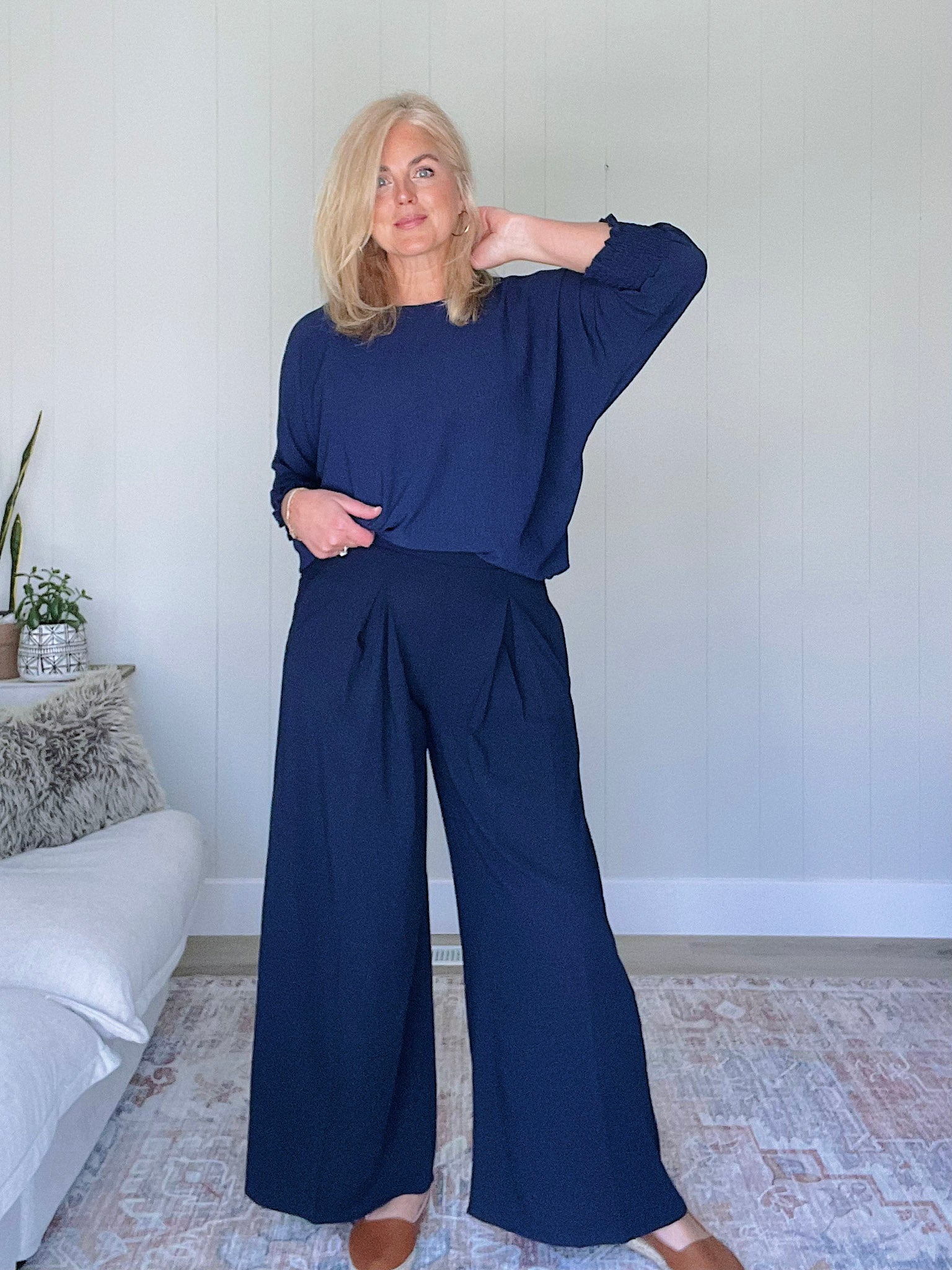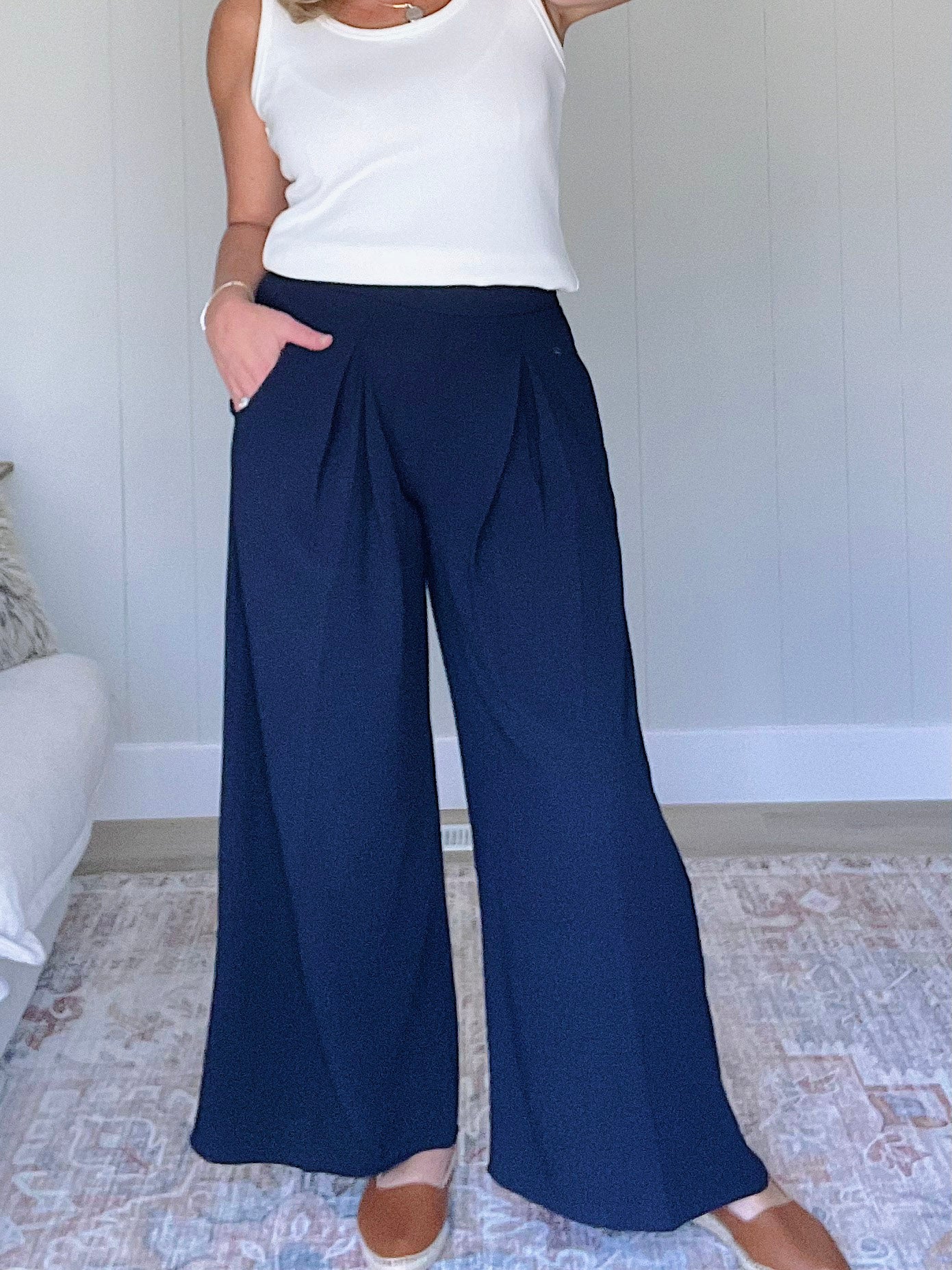 Perfect for the modern traveler, these pleated wide-leg pants blend comfort with effortless style. An elastic waistband ensures all-day comfort, while the flowing silhouette moves easily from airports to offices to casual outings. Made from a slightly textured, versatile navy fabric, they pair seamlessly with your favorite top or the Gathered Cuff Travel Top for a refined finish.