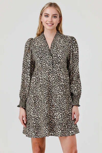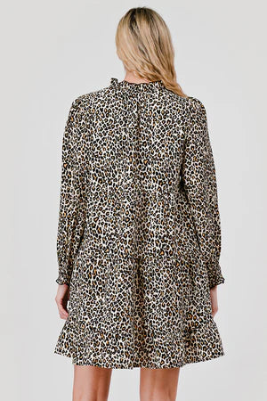 This charming leopard print dress features a flattering tiered silhouette with long sleeves and a playful ruffle V-neckline. Ruched cuffs add texture and detail, while hidden pockets keep your essentials close. Crafted from a soft rayon-nylon blend, it's the perfect piece for effortless style with a wild side.