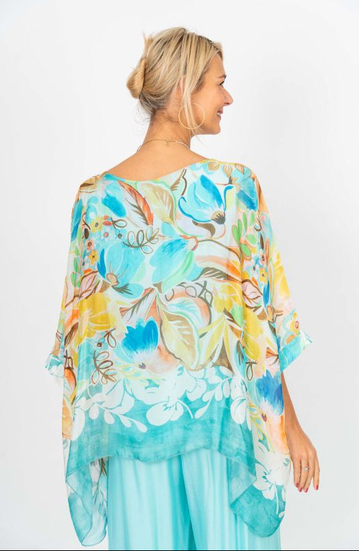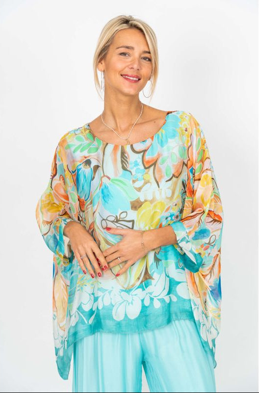 Silky Sleeve Summer Floral Top - Aqua