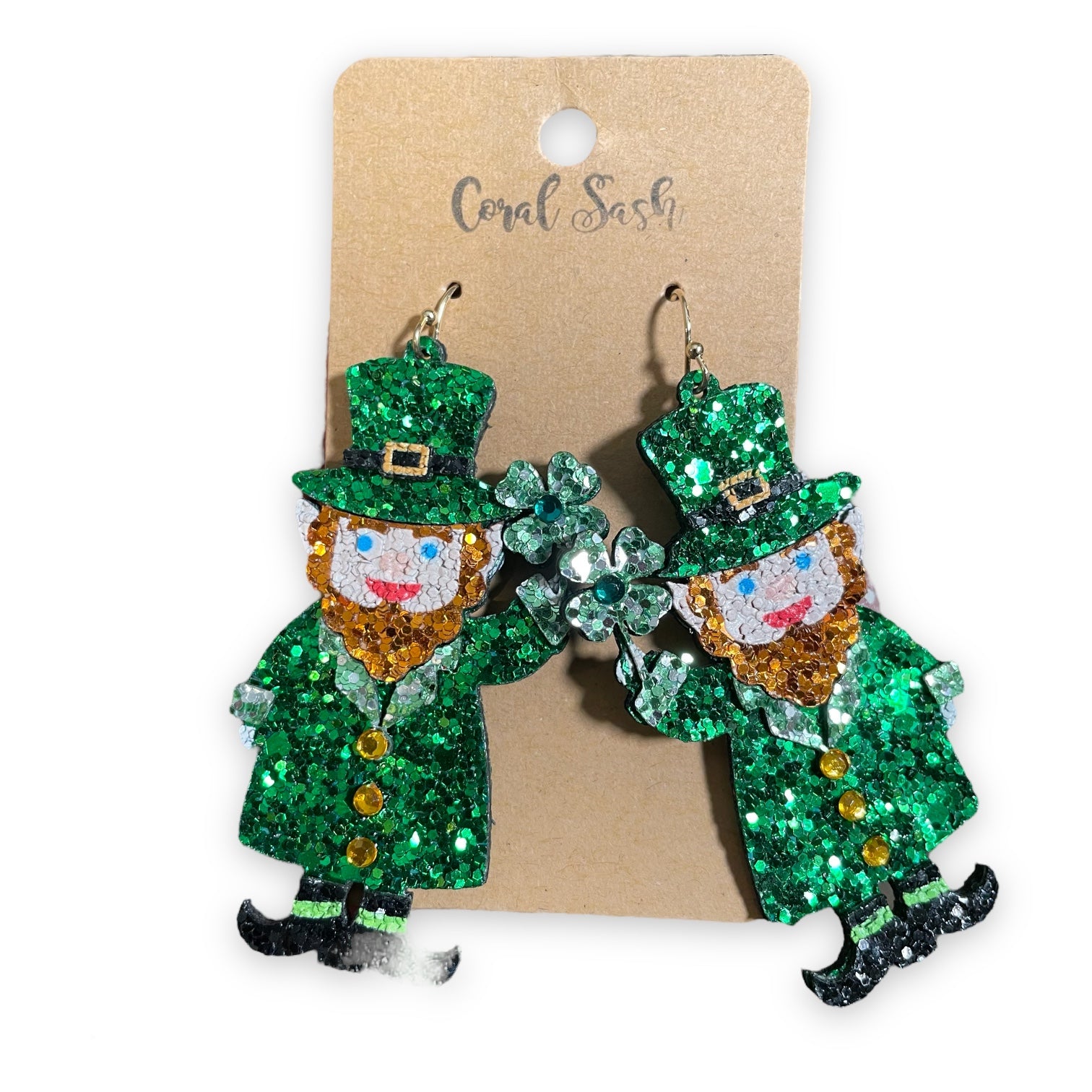 A Leprechaun holding a four-leaf clover is embellished in glitter.