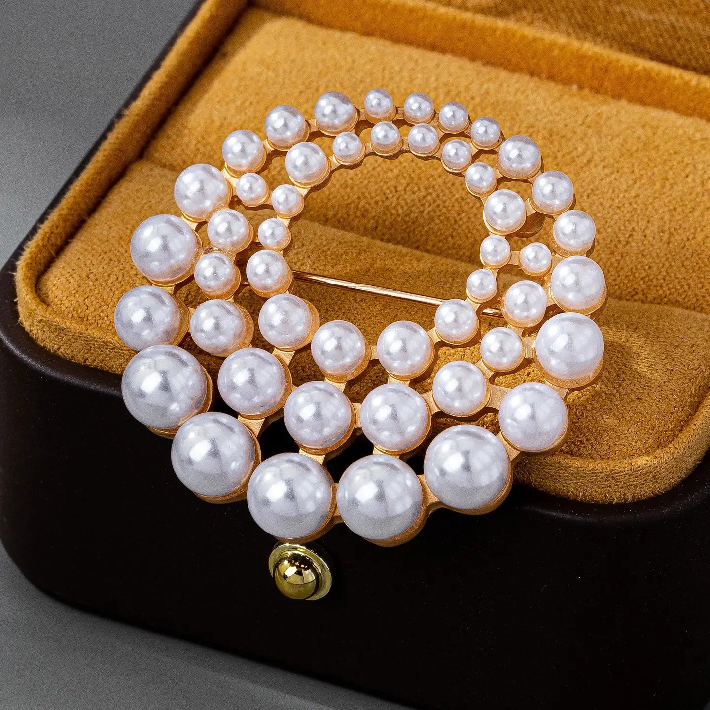 This graduated pearl brooch pin showcases a timeless design with lustrous faux pearls in varying sizes for a refined, sophisticated touch. Its versatile style makes it perfect for adding a hint of vintage charm to blazers, dresses, scarves, or handbags.