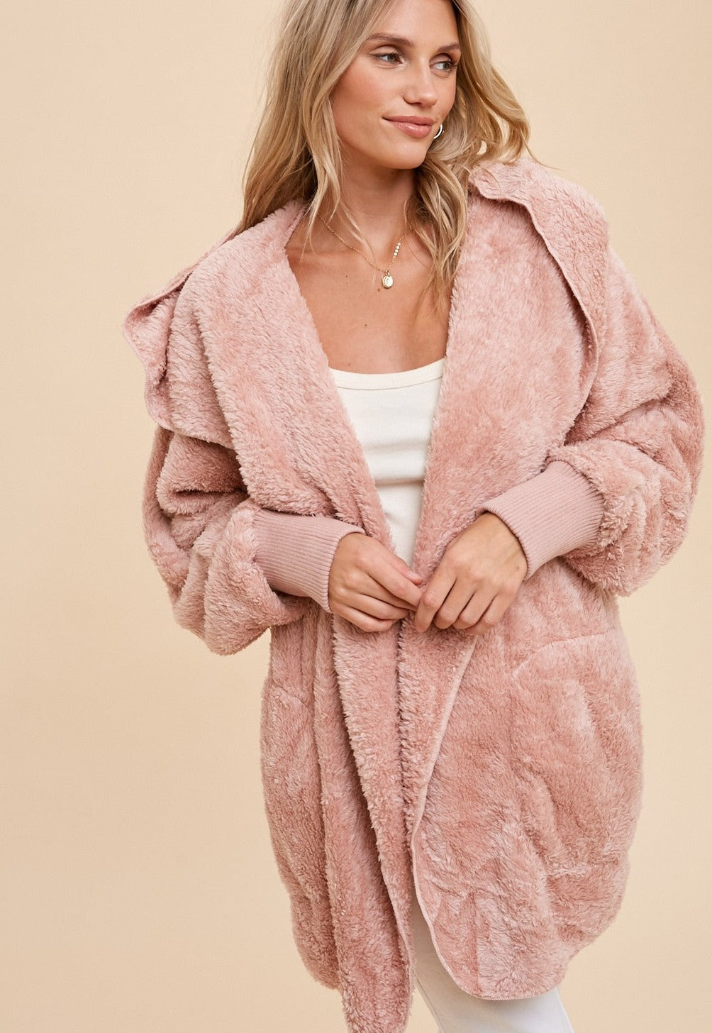 This faux fur plush hooded jacket is a Coral Sash favorite!! With its open front, ultra-soft fabric, banded cuffs and side pockets it will be like a hug you never want to take off.