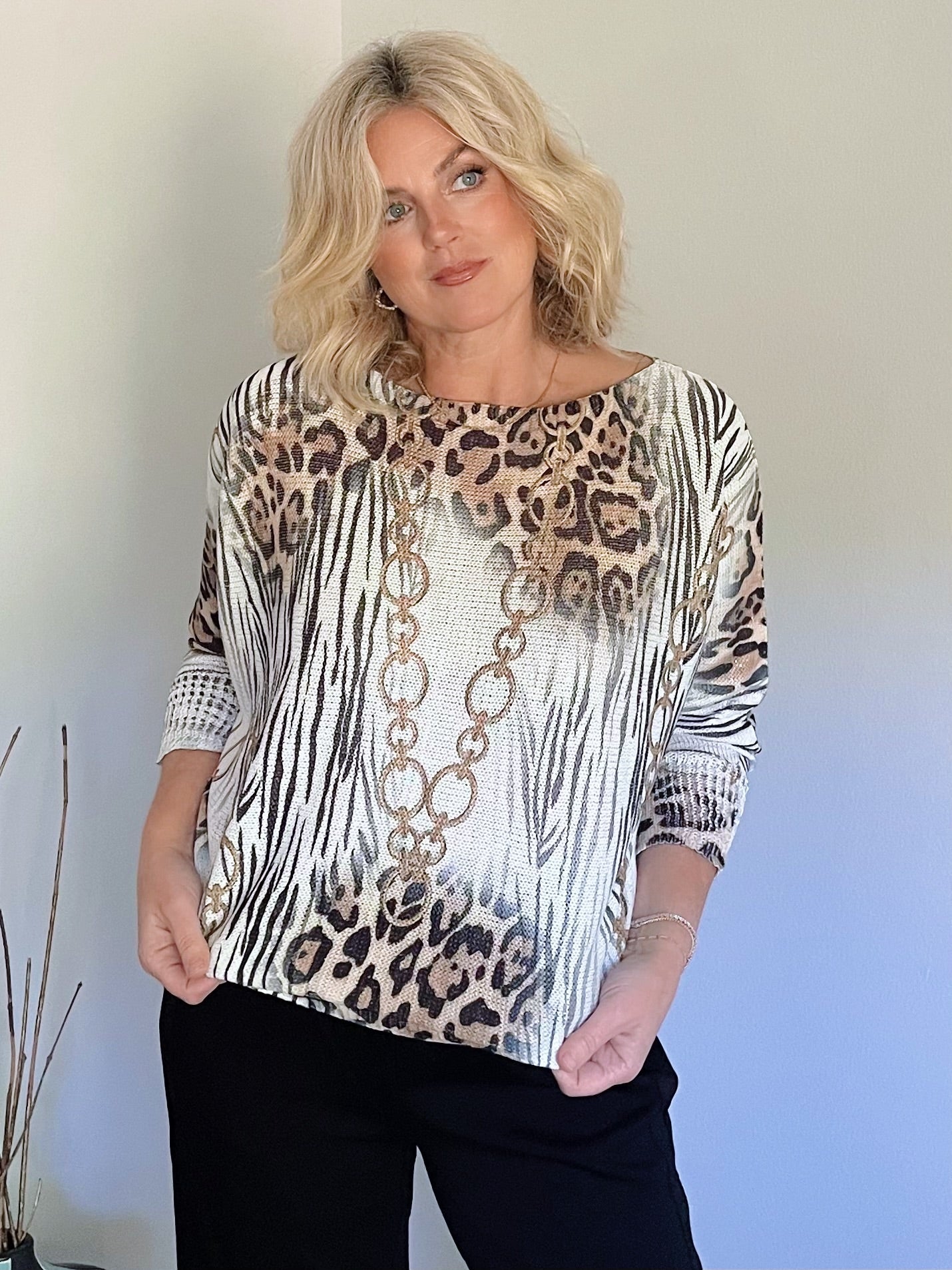 This top showcases an all-over chain necklace and leopard print and complemented by a boatneck neckline and three-quarter dolman sleeves. Crafted from a lightweight, breathable knit fabric, it offers a relaxed fit that drapes elegantly, finished with a gently rounded hem for a polished appearance.