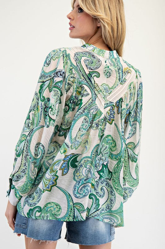 Paisley Printed Bubble Sleeve Top - Spearmint
